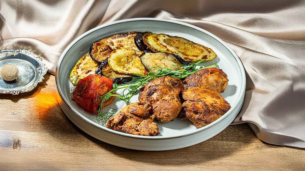 ქათმის მწვადი გრილზე შემწვარი ბოსტნეულით — ნაზი ქათმის ბარკლები, გრილზე შემწვარ ბადრიჯანთან, ყაბაყთან, ბულგარულ წიწაკასთან და ვარდისფერ პომიდორთან ერთად.