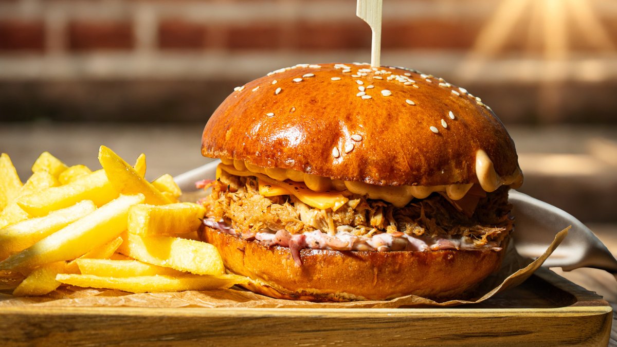 ბურგერი რბილი ღორის ხორცით, ყველით, მარინადებული კიტრით და კოლსლოუს სალათით