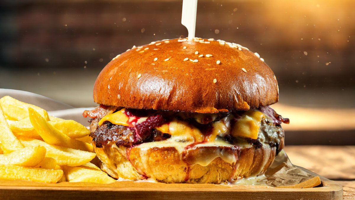ბურგერი საქონლის ხორცით და ლურჯი ყველით