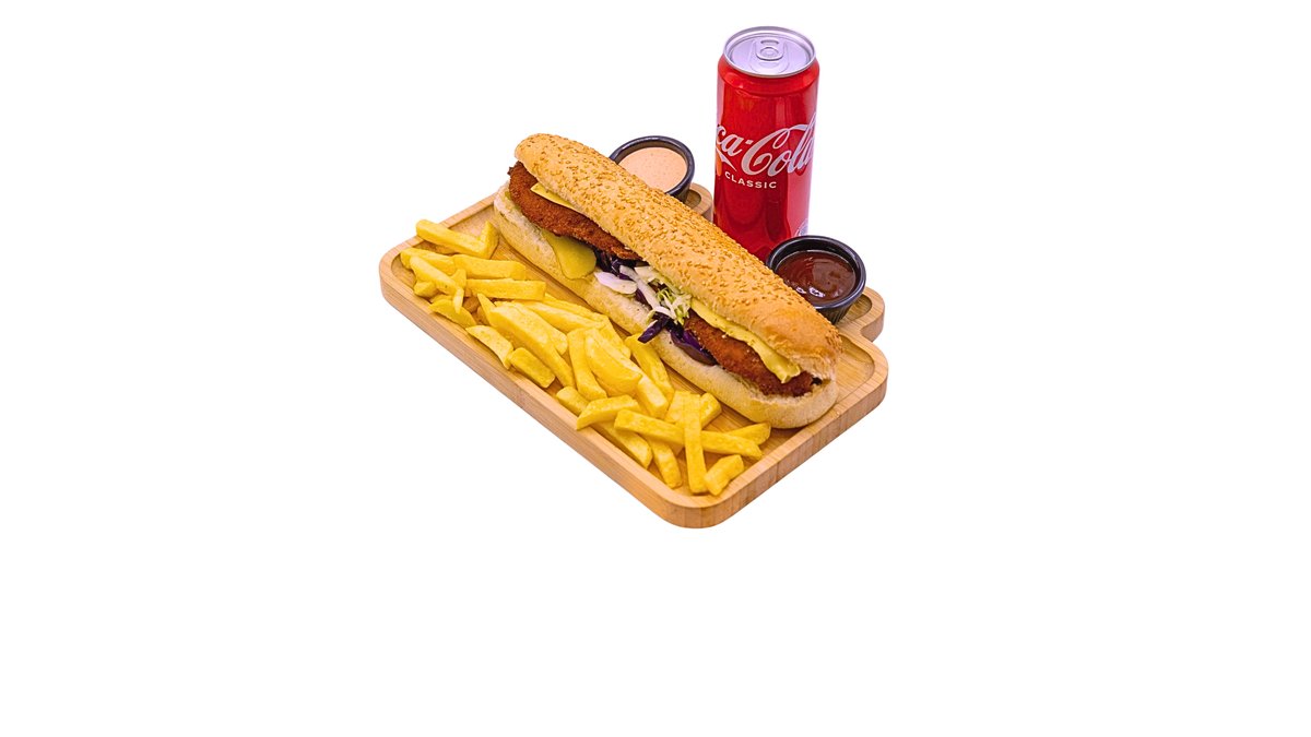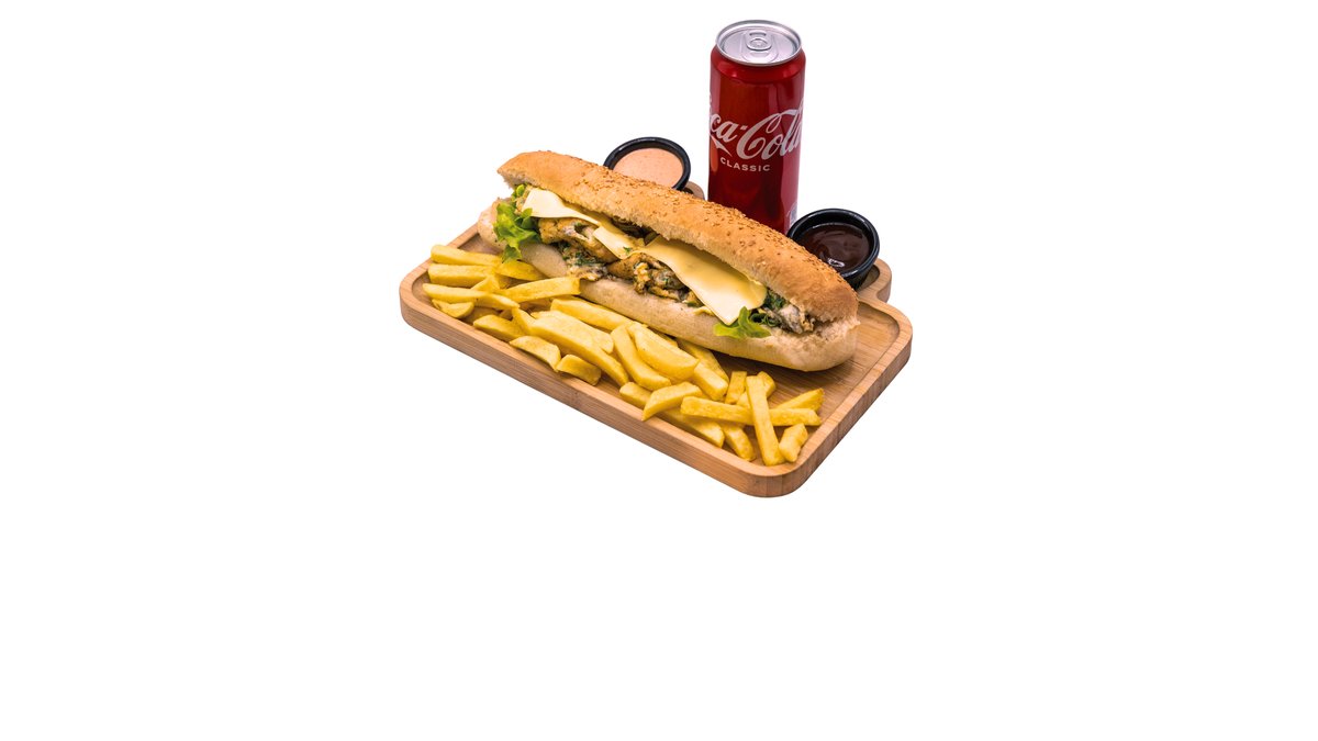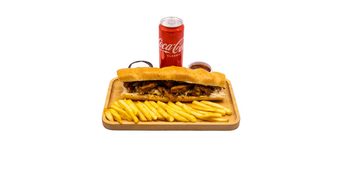 Dough, chicken fillet, Arabic salad, mayonnaise, hummus, ketchup, fries, Coca-Cola