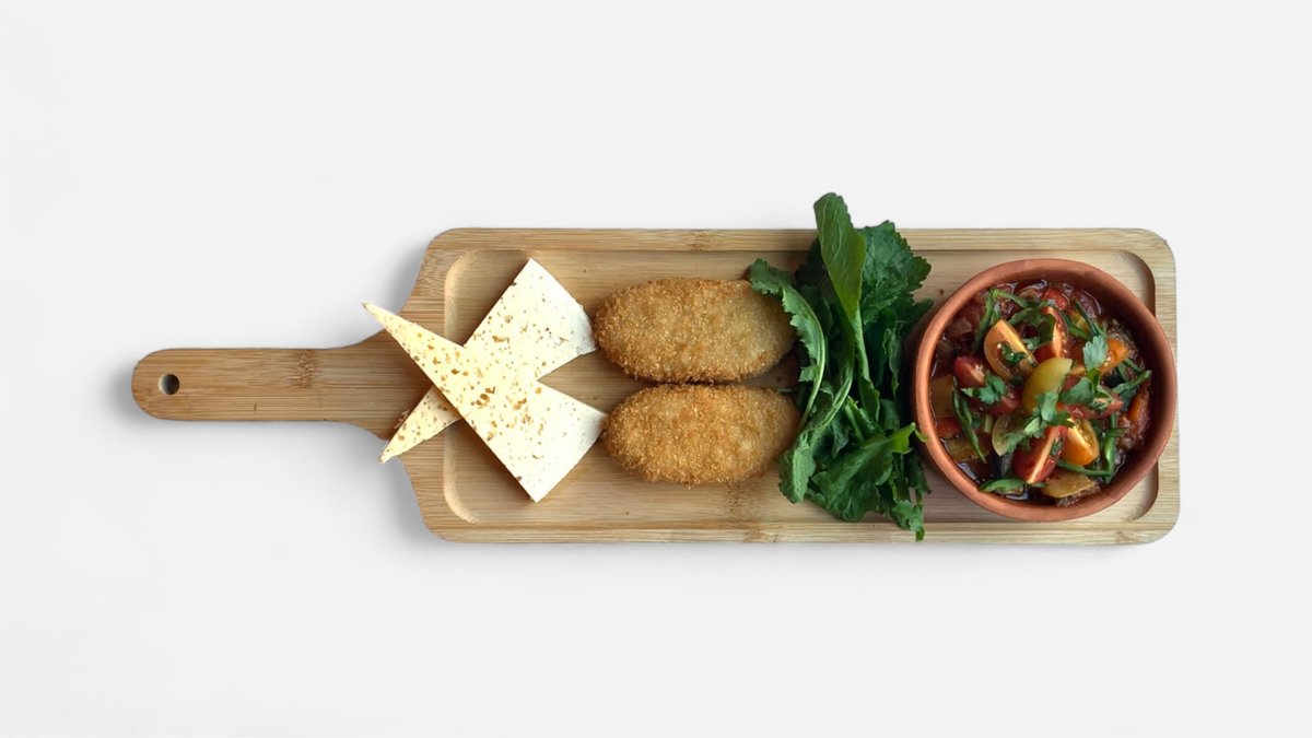 კიტრის და პომიდვრის სალათი თხილის პასტით და სულგუნის ჩიფსით