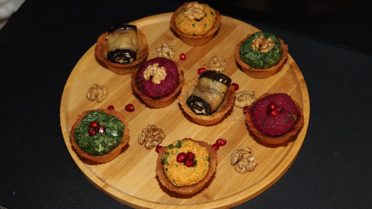 traditional Georgian pkhali – minced vegetables with walnuts and herbs – served with homemade corn bread