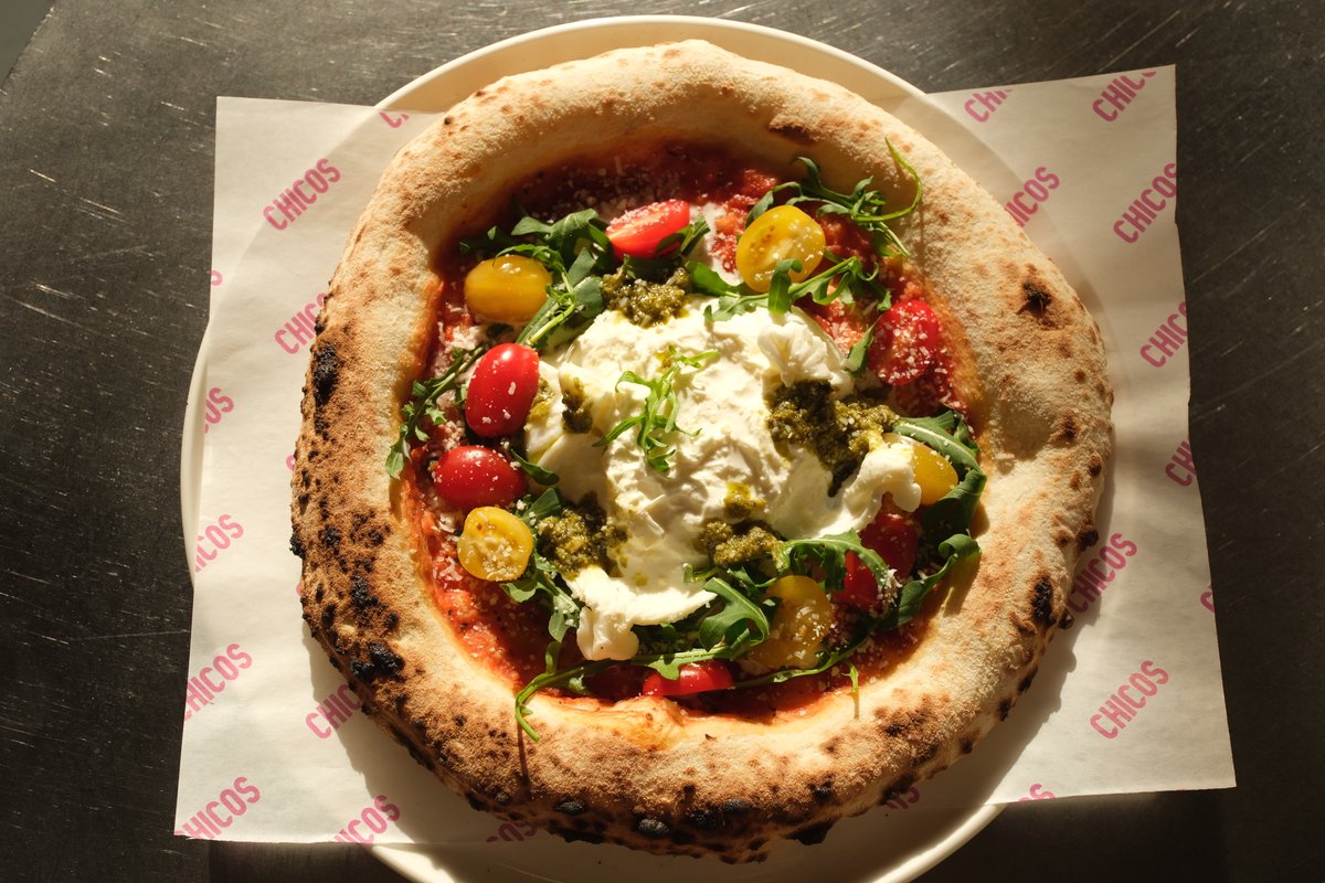 მარინარას სოუსი, მთელი ბურატა, ჩერი პომიდორი, რუკოლა, პესტო, პარმეზანი