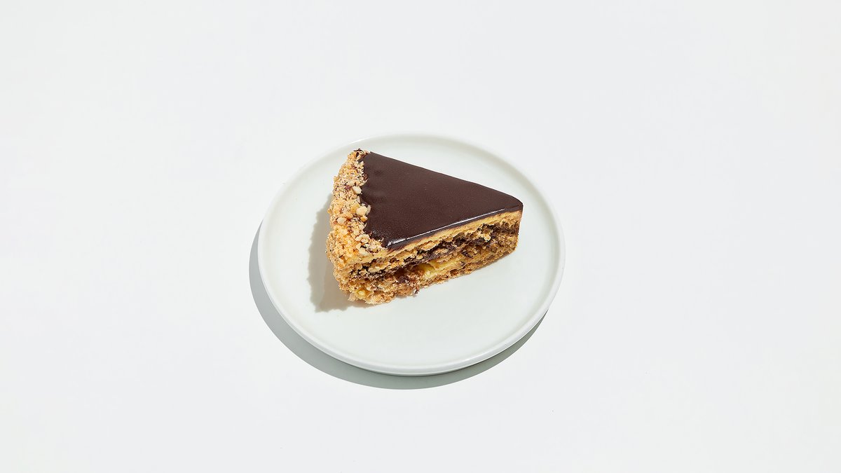 classic crispy layered dough with light custard cream and glazed hazelnuts on top