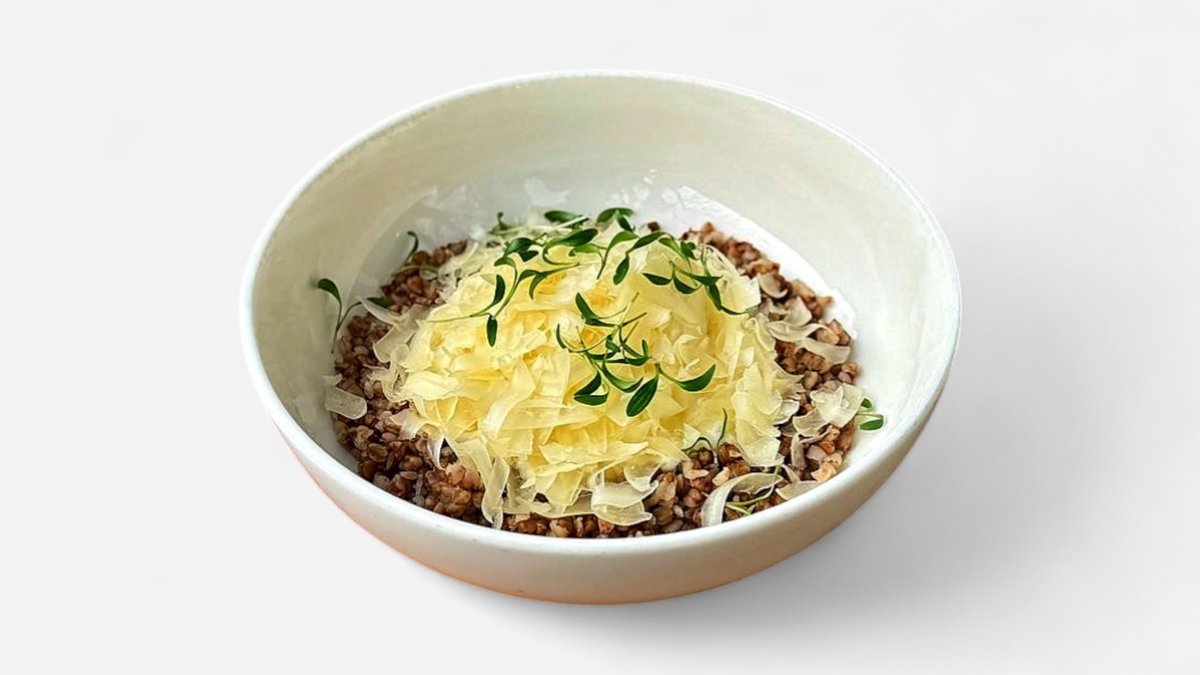 with stracciatella, mushrooms, backed pepper, honey mustard sauce