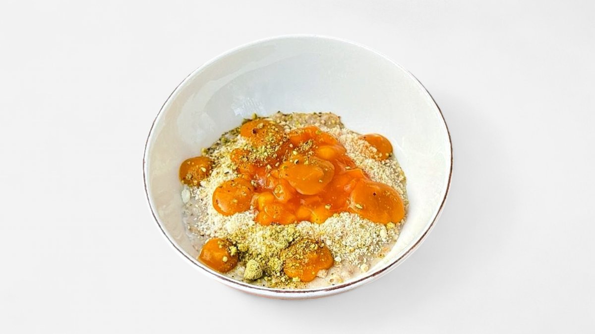 cottage cheese pancakes (3 pcs) with cream cheese, mango puree, canned peaches and coconut crumble