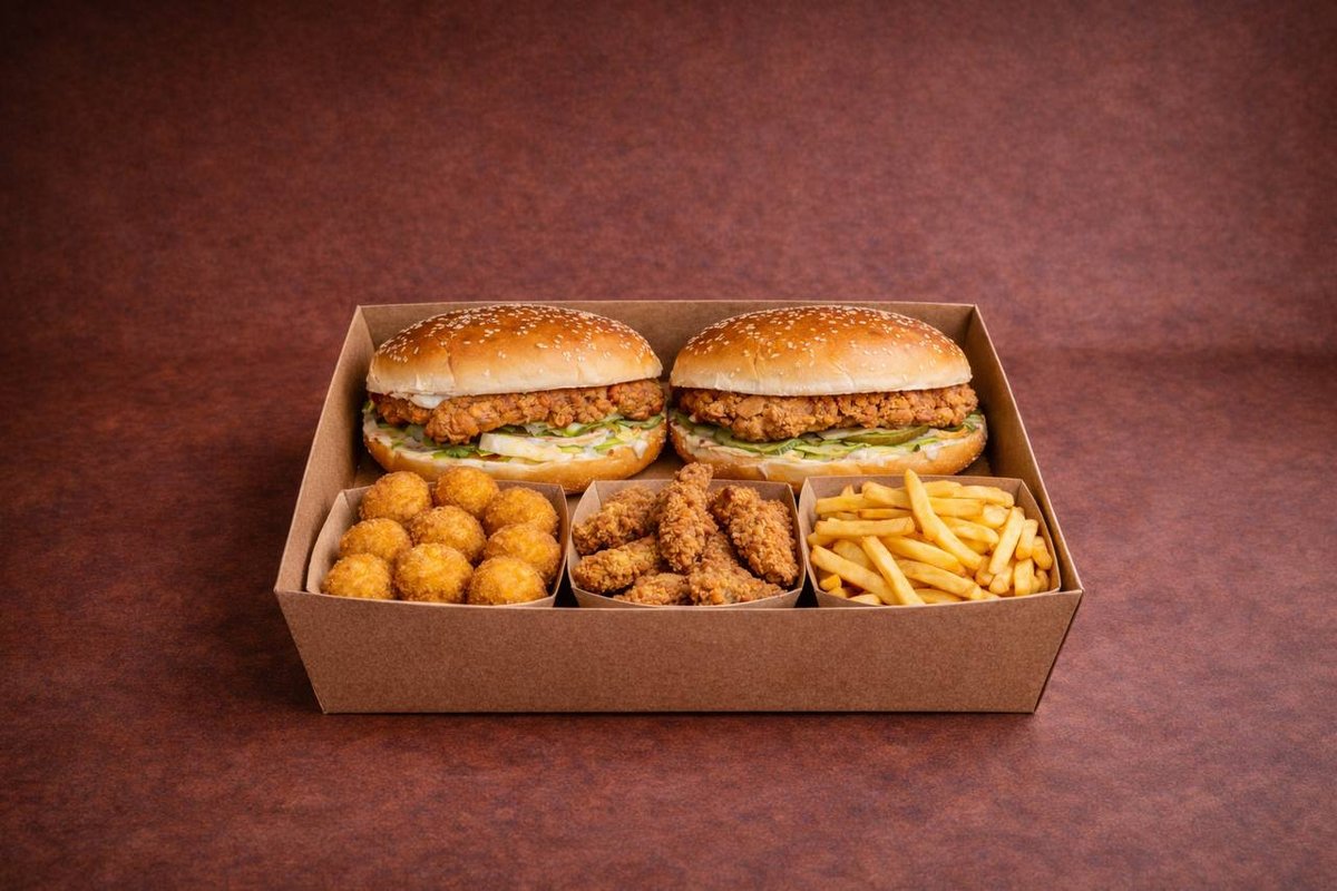 2 burger, 130gr stripes, 10 pcs potato balls, french fries