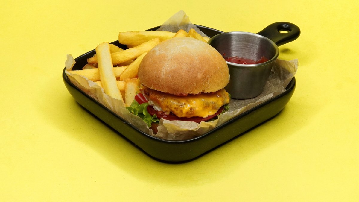 Kid's Chicken Burger: Juicy chicken cutlet nestled in a soft bun, layered with tangy tomato, cheddar cheese, and fresh salad. Comes with crispy fries.