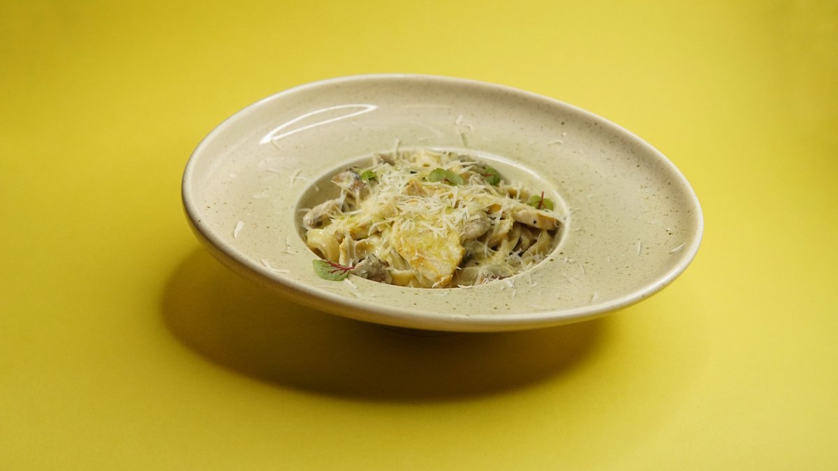 Enjoy our Fettuccine pasta with sous-vide chicken, parmesan, shkmeruli sauce, mushrooms, and a hint of black pepper. Warm and satisfying!