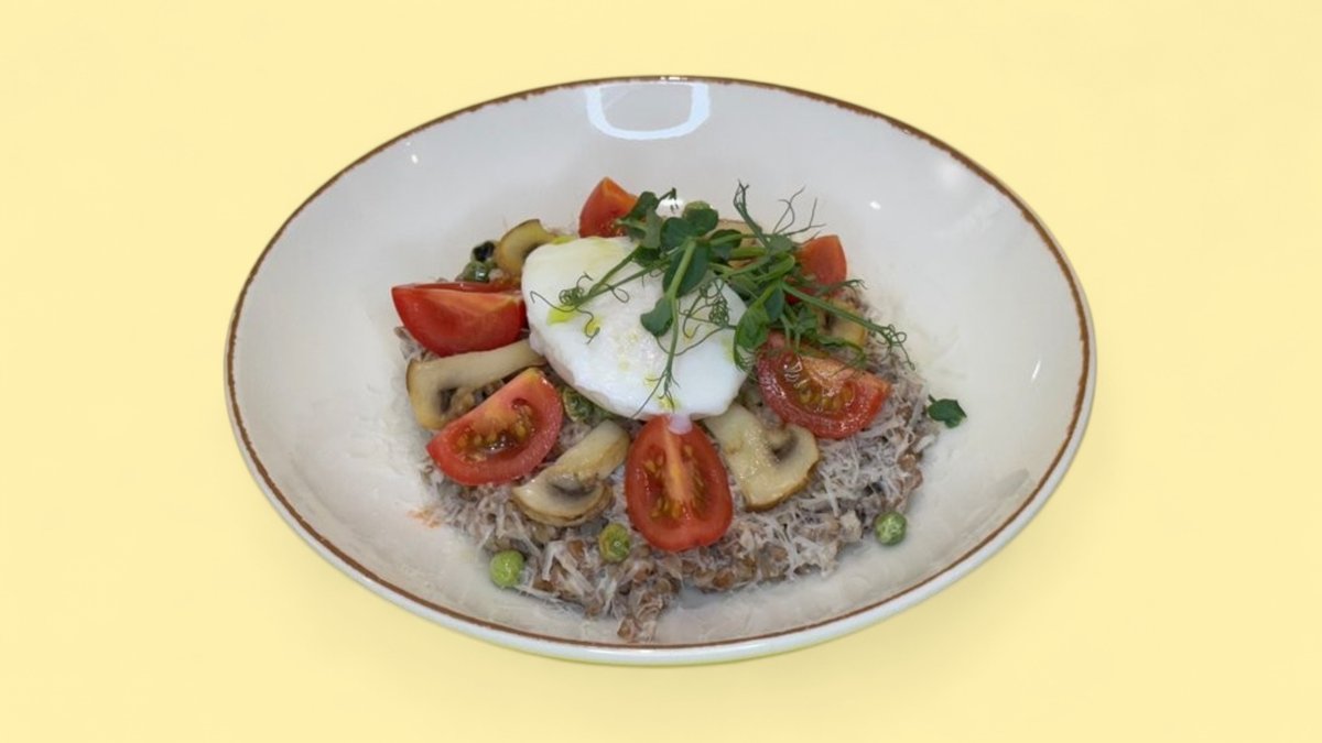 Kickstart your day with our nutritious creamy buckwheat topped with parmesan, a flawlessly poached egg, and crisp fresh veggies. Perfect morning meal!