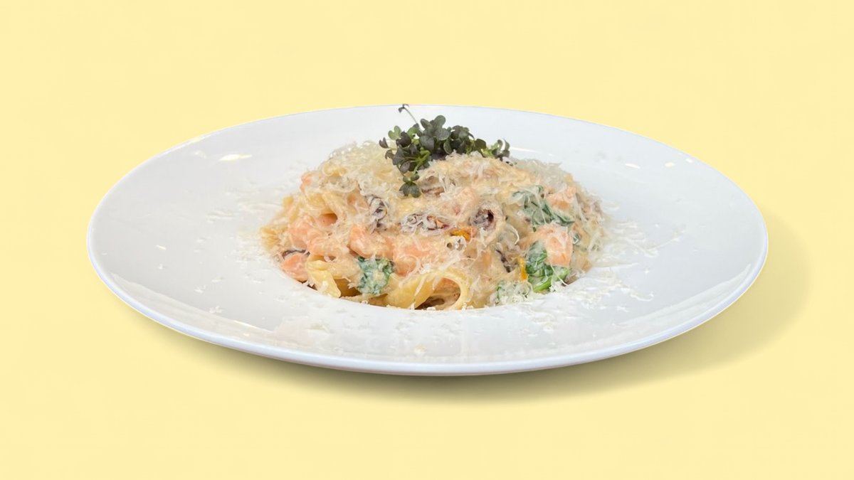 Savor our breakfast Fettuccine pasta, richly loaded with succulent grilled shrimps, sрpinach, creamy cashew sauce, parmesan and fresh microgreens.