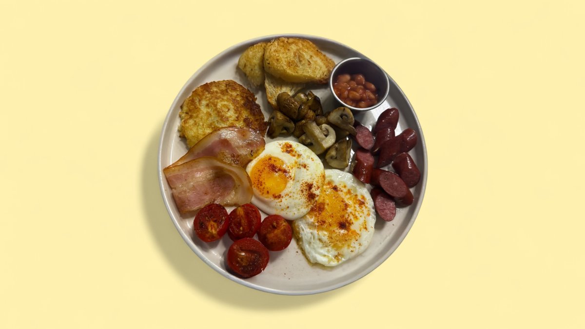 2 sunny-side up eggs, sausages, bacon, potato dranik, beans in tomato sause, mushrooms, cherry tomatoes, tartine