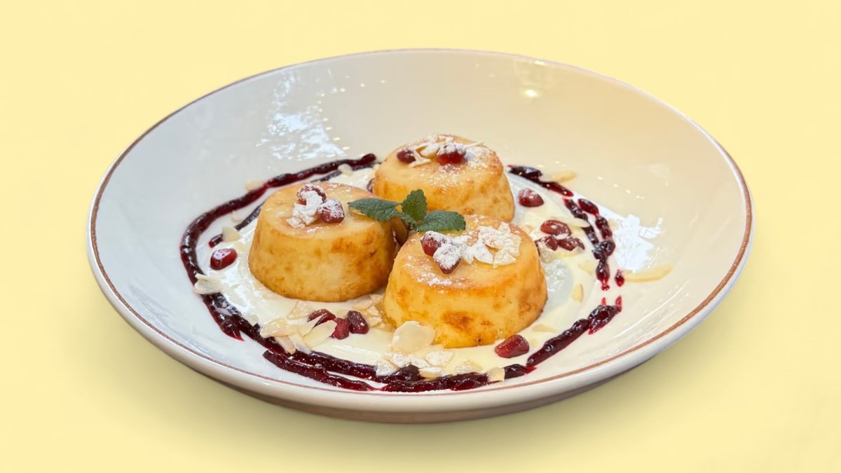 Savor 4 fluffy shrink, made from rice flour & topped with sour cream mousse, berry coulis, nuts