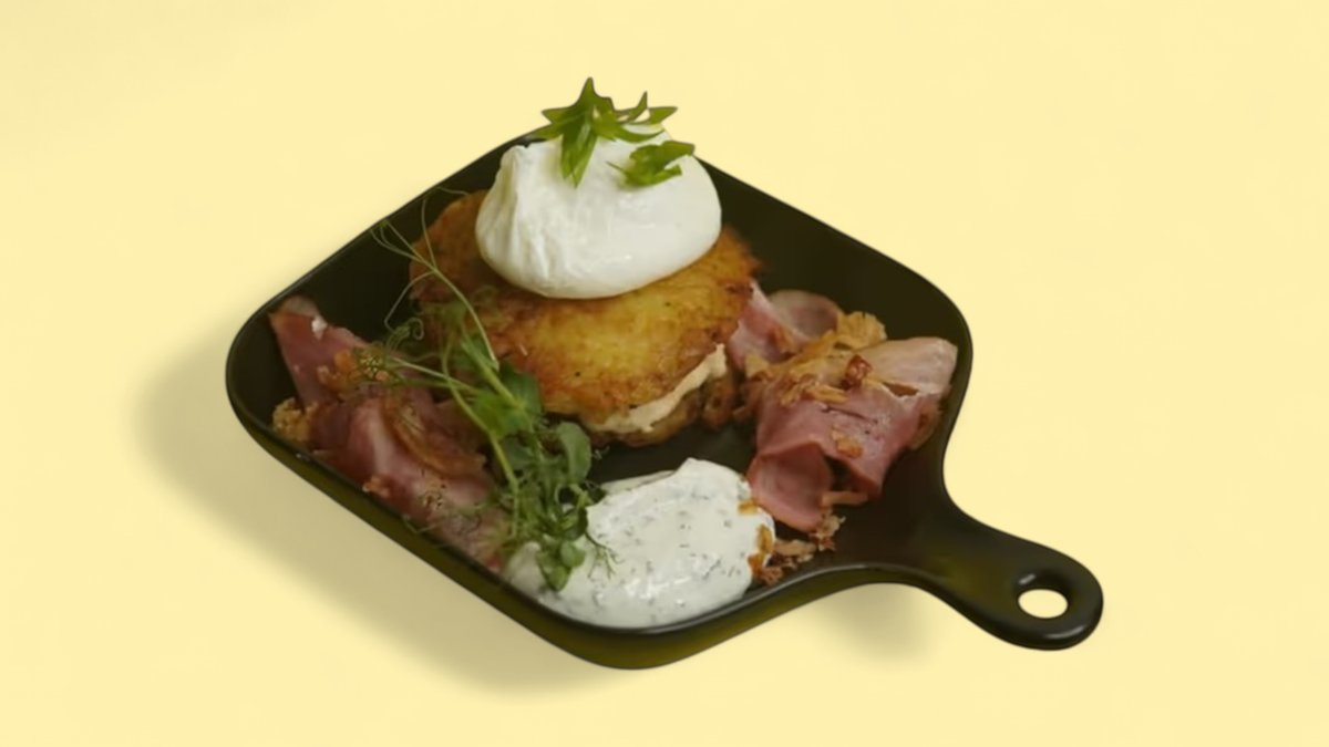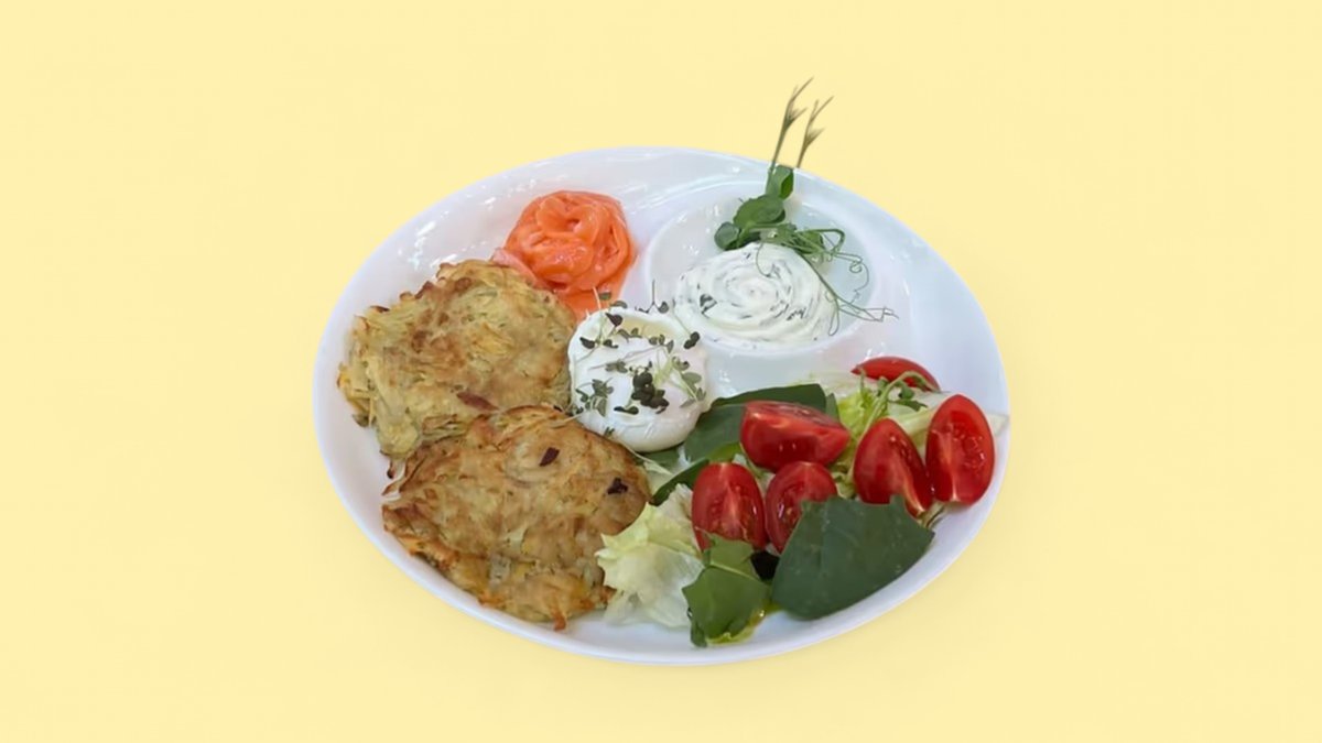 potato draniki, lightly salted salmon, poashed eggs, mixed greens, sour cream sause
