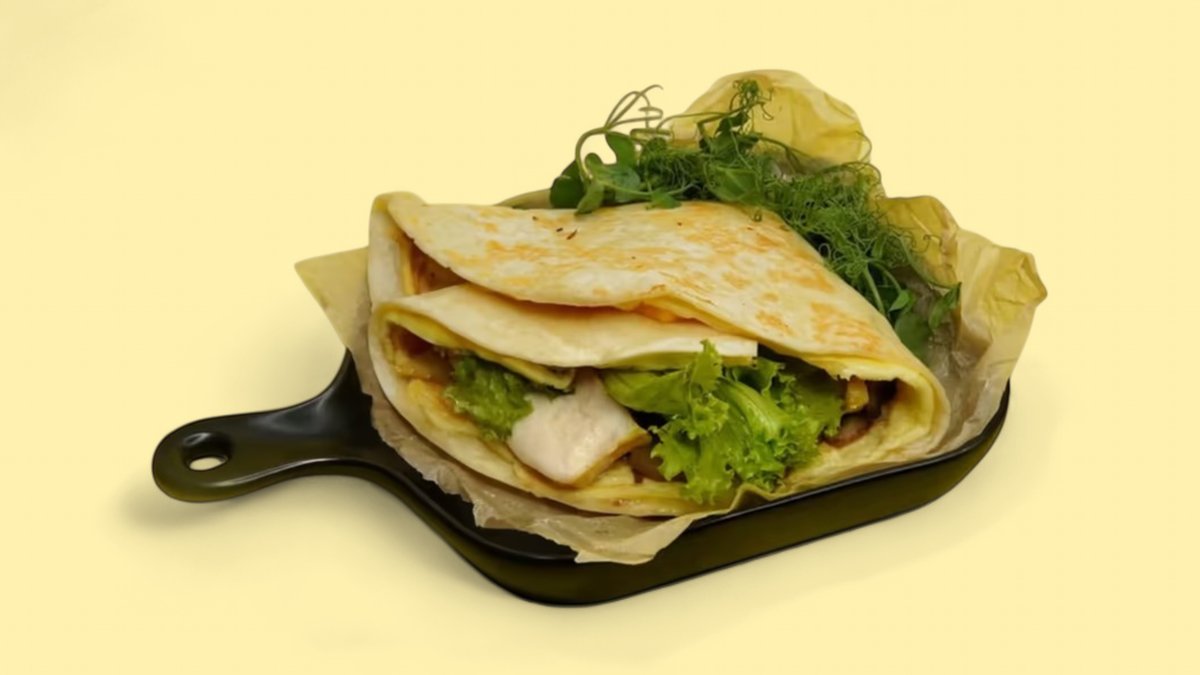 Enjoy our Tortilla Breakfast: A sumptuous omelette wrapped in a crispy tortilla, packed with chicken, mushrooms, and creamy aioli sauce. Ideal for a morning treat!