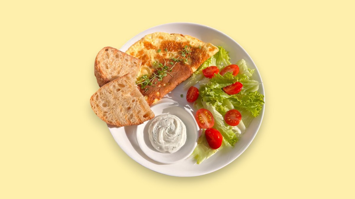 Breakfast with omelette, salad with greens and cherry tomatoes, tartine bread and sour cream sauce