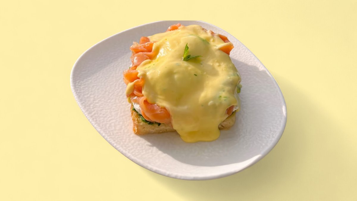 Toast with 2 poashed eggs, spinach pesto, salmon and hollandaise sause