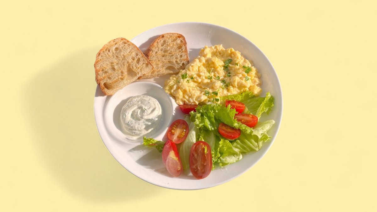 Breakfast with 2 scrabled eggs, salad with greens and cherry tomatoes, tartine bread and sour cream sauce