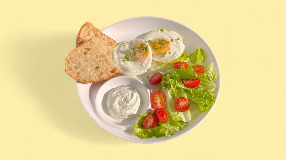 Breakfast with 2 fried eggs, salad with greens and cherry tomatoes, tartine bread and sour cream sauce