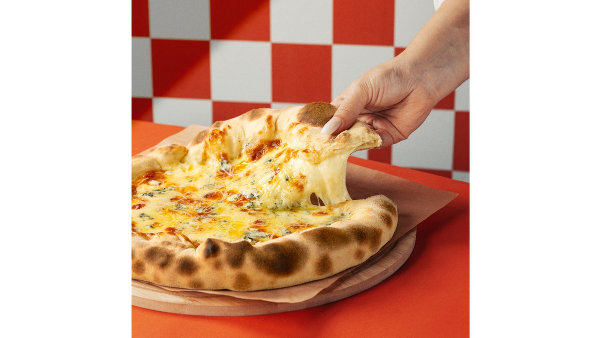 პიცის ნაპირები სავსეა ყველით, ტოპინგები:დამწიფებული მოცარელა, ბეშამელის სოუსი, ლურჯი ყველი, ამერიკული ჩედარი, პარმეზანი.