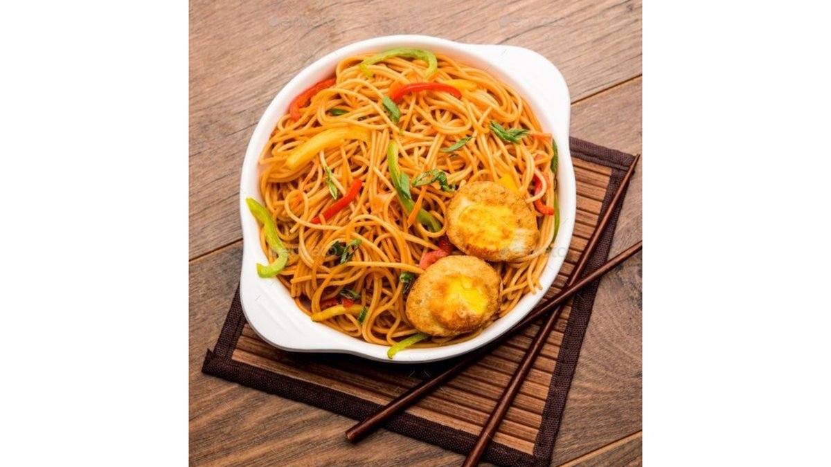 Noodles, Eggs, Soy sauce, Ginger-garlic paste, Bell peppers, Carrots, Spring onions, Oil, Salt, Pepper