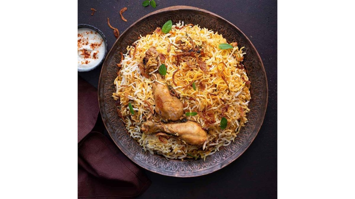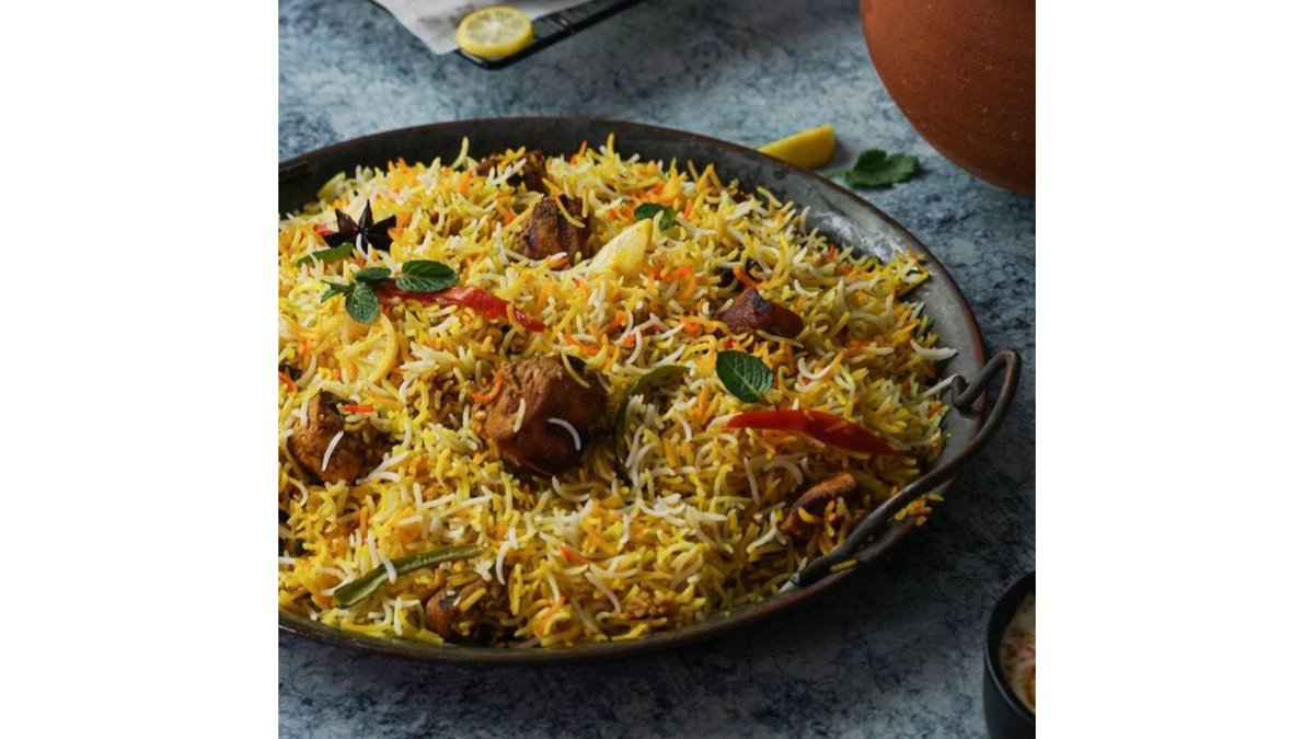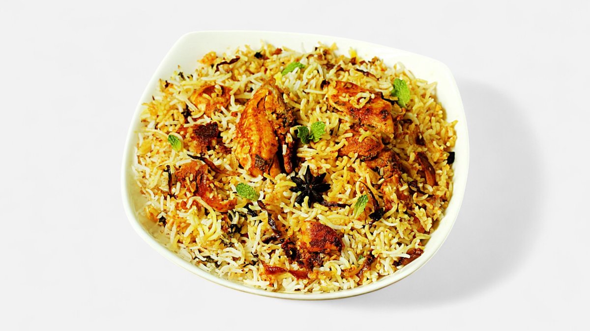 Basmati rice, Chicken tikka (marinated chicken), Yogurt, Onions, Tomatoes, Ginger-garlic paste, Biryani spices, Oil, Coriander, Mint, Salt
