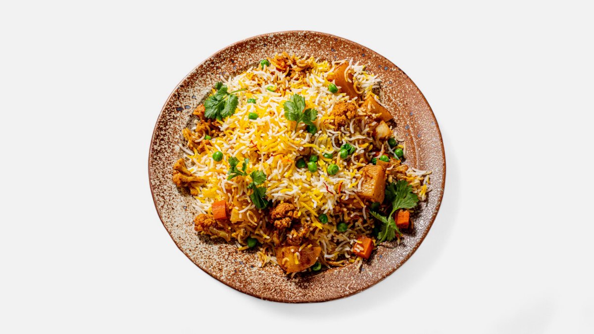 Basmati rice, Chicken, Yogurt, Onions, Tomatoes, Ginger-garlic paste, Biryani spices, Oil, Coriander, Mint, Salt, Saffron