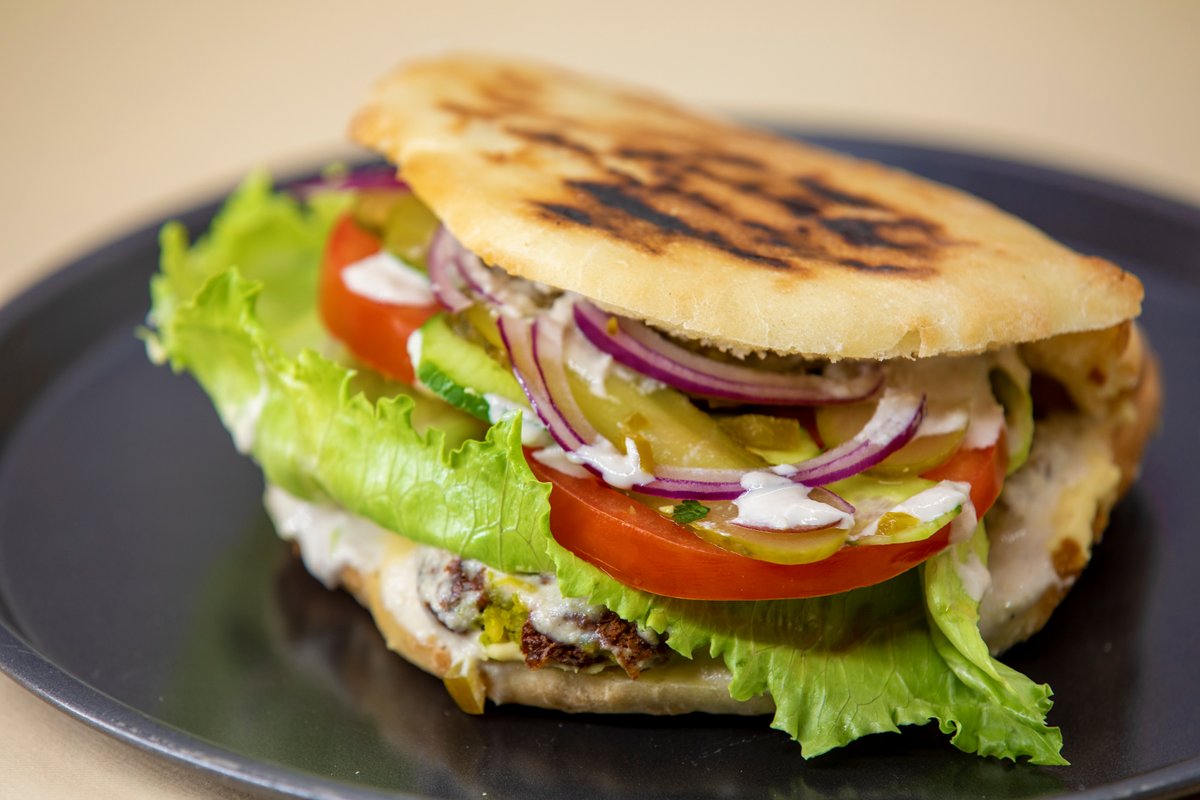 ახლად გამომცხვარი ლავაში,ჰუმუსი,ბბქ.სოუსში შებრაწული სეიტანი(ხორბლის პროტეინი),პომიდორი,კიტრი,აისბერგი,წითელი ხახვი,წითელი მჟავე კომბოსტო,ხალაპენიო,მჟავე კიტრი,სალსა,სეზამის სოუსი,ბურგერის სოუსი