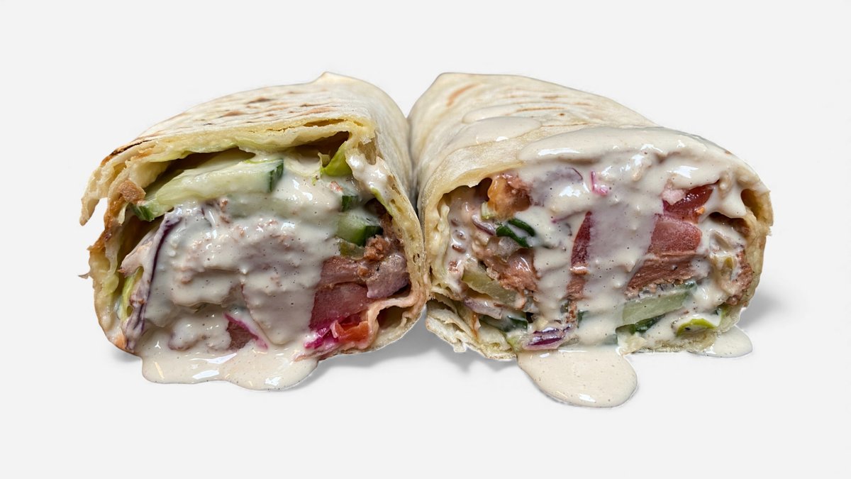 შებოლილი ვეგანური ,ახალგამომცხვარი ლავაში,ჰუმუსი,პომიდორი,კიტრი,მჟავე კიტრი,წითელი ხახვი,სალსა,წითელი კომბოსტოს მარინადი,ტაჰინის სოუსი,ბურგერის სოუსი,ხალაპენიო,აისბერგი