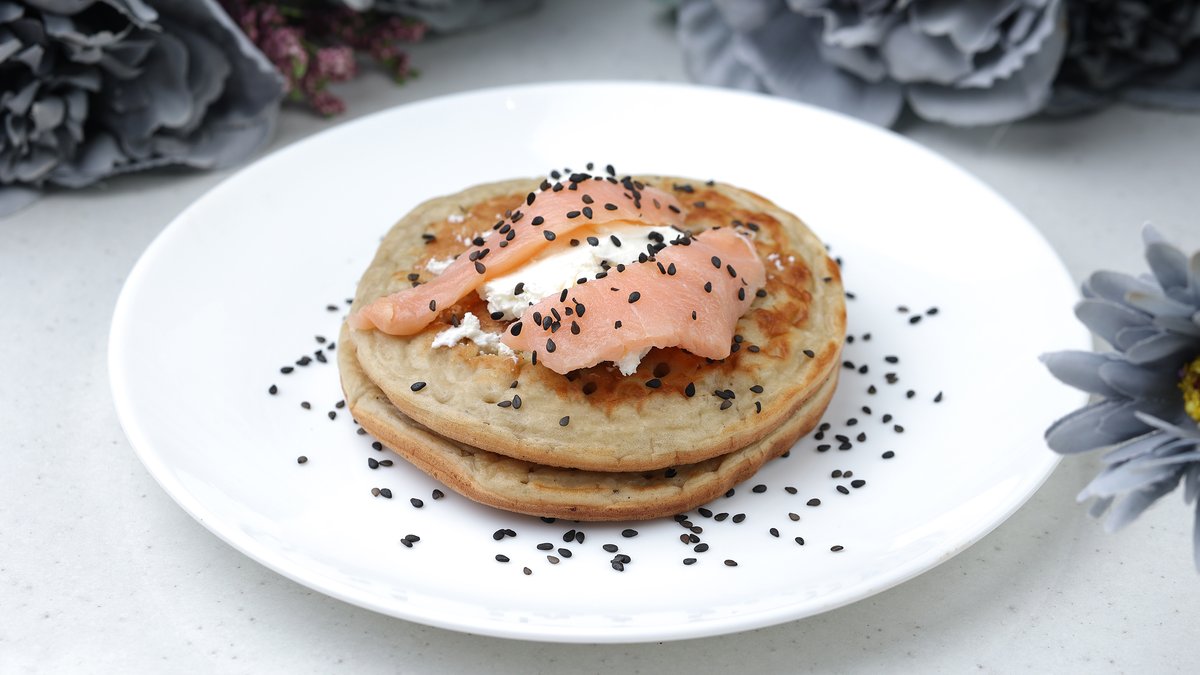 გრილზე მოყვანილი ორაგული, კრემყველი, სალათის ფურცლები, კიტრის მარინადი, ნახშირის პური, სეზამის მარცვლები