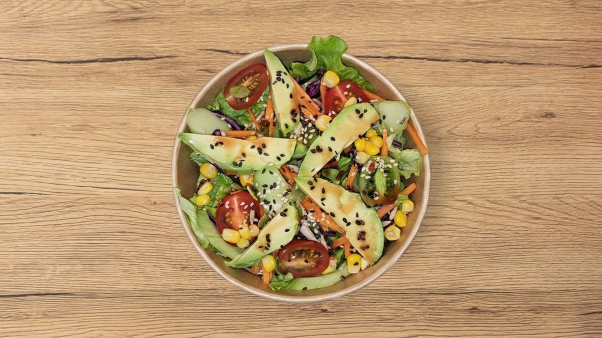 სალათის მიქსი, პომიდორი ჩერი, კიტრი, წით.კომბოსტო, სტაფილო,ავოკადო, სიმინდი, სეზამის მარცვლები, გოგრის გული, მზესუმზირა,ბროწეულის სოუსი,შავი ბალზამიკო, ზეითუნი