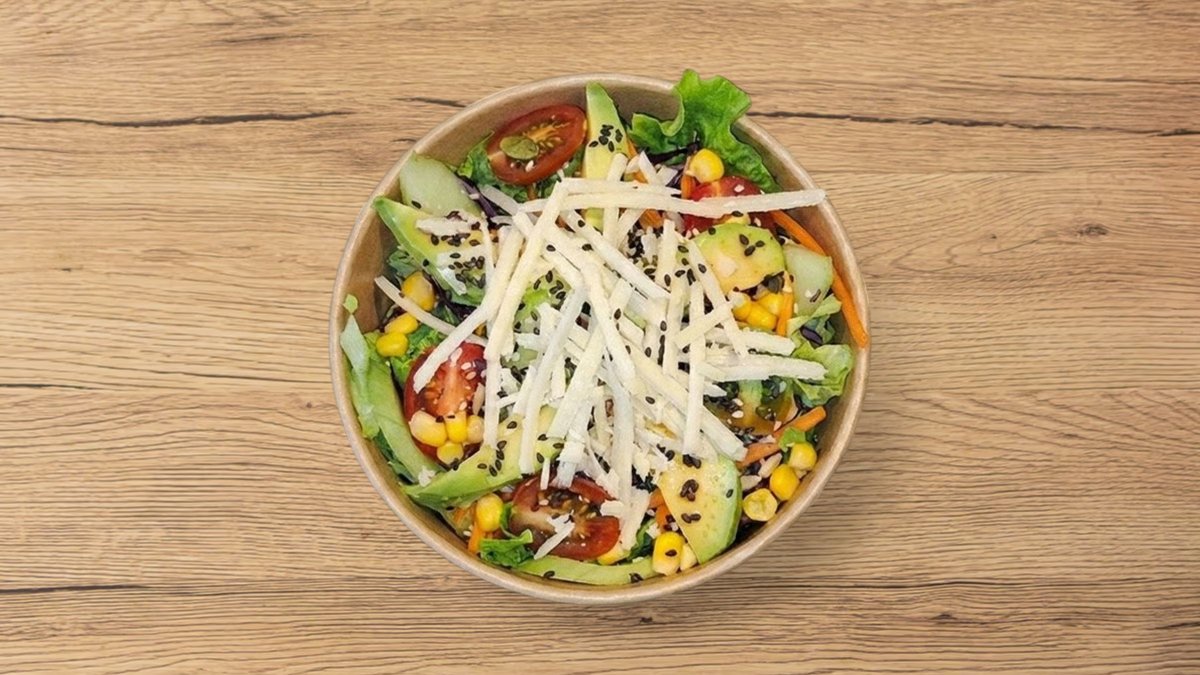 სალათის მიქსი, პომიდორი ჩერი, კიტრი, წით.კომბოსტო, სტაფილო,ავოკადო, პარმეზანი,სიმინდი, სეზამის მარცვლები, გოგრის გული, მზესუმზირა,ბროწეულის სოუსი,შავი ბალზამიკო, ზეითუნი
