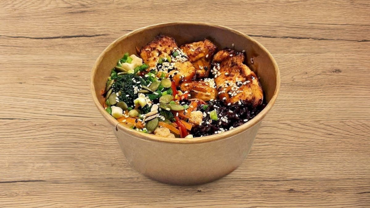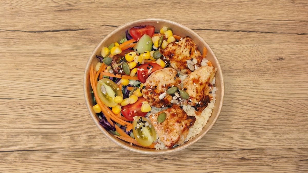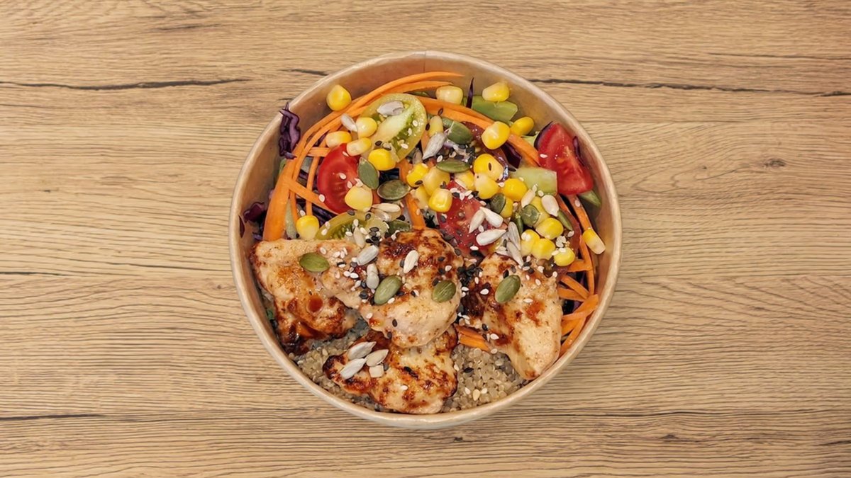 ქათმის ფილე ტერიაკის სოუსით, ქინოა, სალათის მიქსი, პომიდორი ჩერი, კიტრი, წით.კომბოსტო, სტაფილო, სიმინდი, სეზამის მარცვლები, გოგრის გული, მზესუმზირა,ბროწეულის სოუსი,შავი ბალზამიკო, ზეითუნი.
