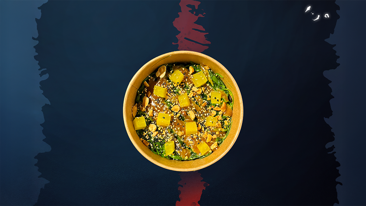 ბრინჯი, პოკეს სოუსი, კრევეტები, ავოკადო, მანგო, ჰიაში ვაკამე, სიმინდი, ნორი, სეზამი შერეული.