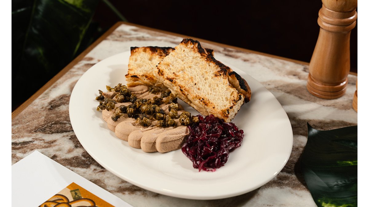 ქათმის ღვიძლი, სტაფილო,კარაქი, კონიაკი,კრემ ყველი გარნირი:ფოკაჩა, კარამელიზირებული ხახვი, კაპერსის ჩიფსი ალერგენები:გლუტენი, რძე, გოგრის თესლი, მზესუმზირა