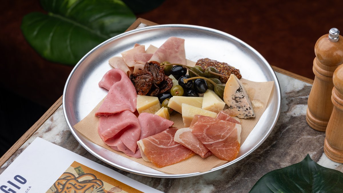 მორტადელა,პროშუტო კრუდო,პროშუტო კოტო,პარმეზანი,პეკორინო,ზეთისხილი, კაპერსი,მზეზე გამომშრალი პომიდორი, ბლუჩიზი,მდოგვი ალერგენი:რძე,მდოგვი