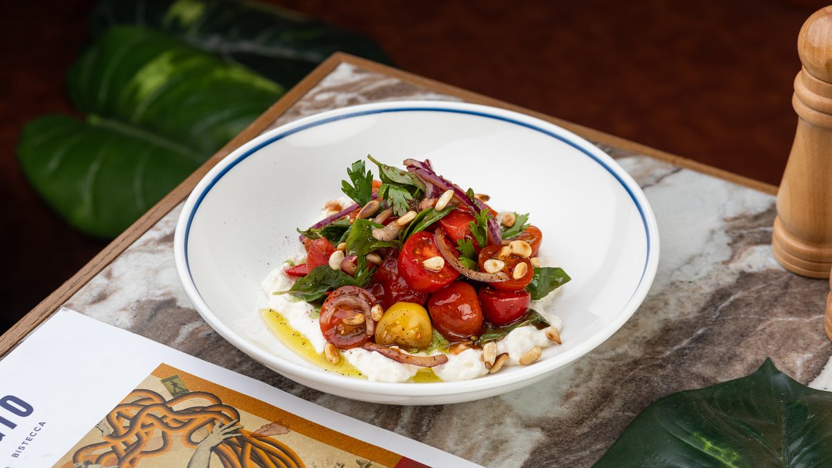სტრაჩატელა,ოხრახუში,პიტნა,კედრის კაკალი, პომიდორი ჩერი,პომიდორი,ბალზამიკოს დრესინგი,წითელი ხახვი,წითელი წიწაკა,ბაზილიკი,პესტო ალერგენი:ნიგოზი,კედრის კაკალი,რძე