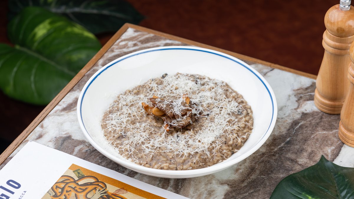 ბრინჯი, შიტაკი სოკო, ქამა სოკო, პარმეზანი, მოცარელა, კვერცხი, პილპილი, კანგაცლილი პომიდორი გარნირი:პროშუტო კრუდო ალერგენი: რძე, გლუტენი, კვერცხი