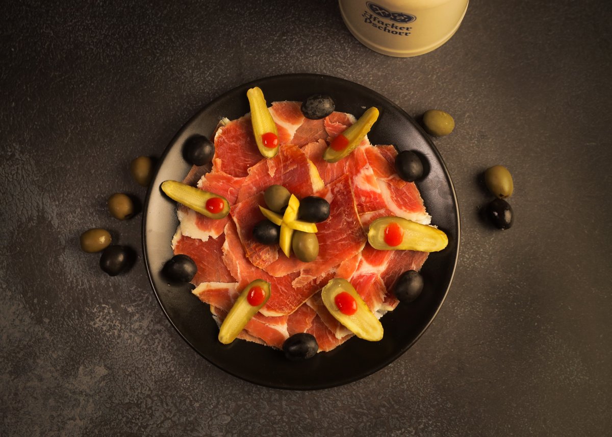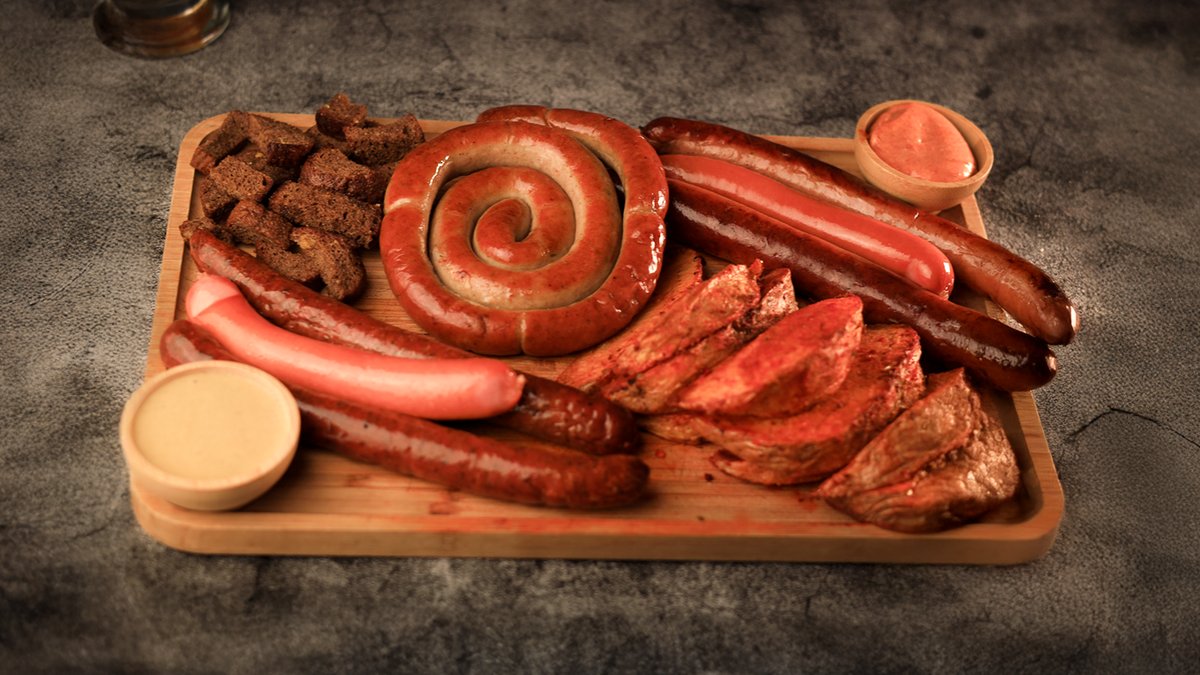 ღორის კანჭი, სოსისი, მექსიკური კარტოფილი, მწნილი, სოუსი
