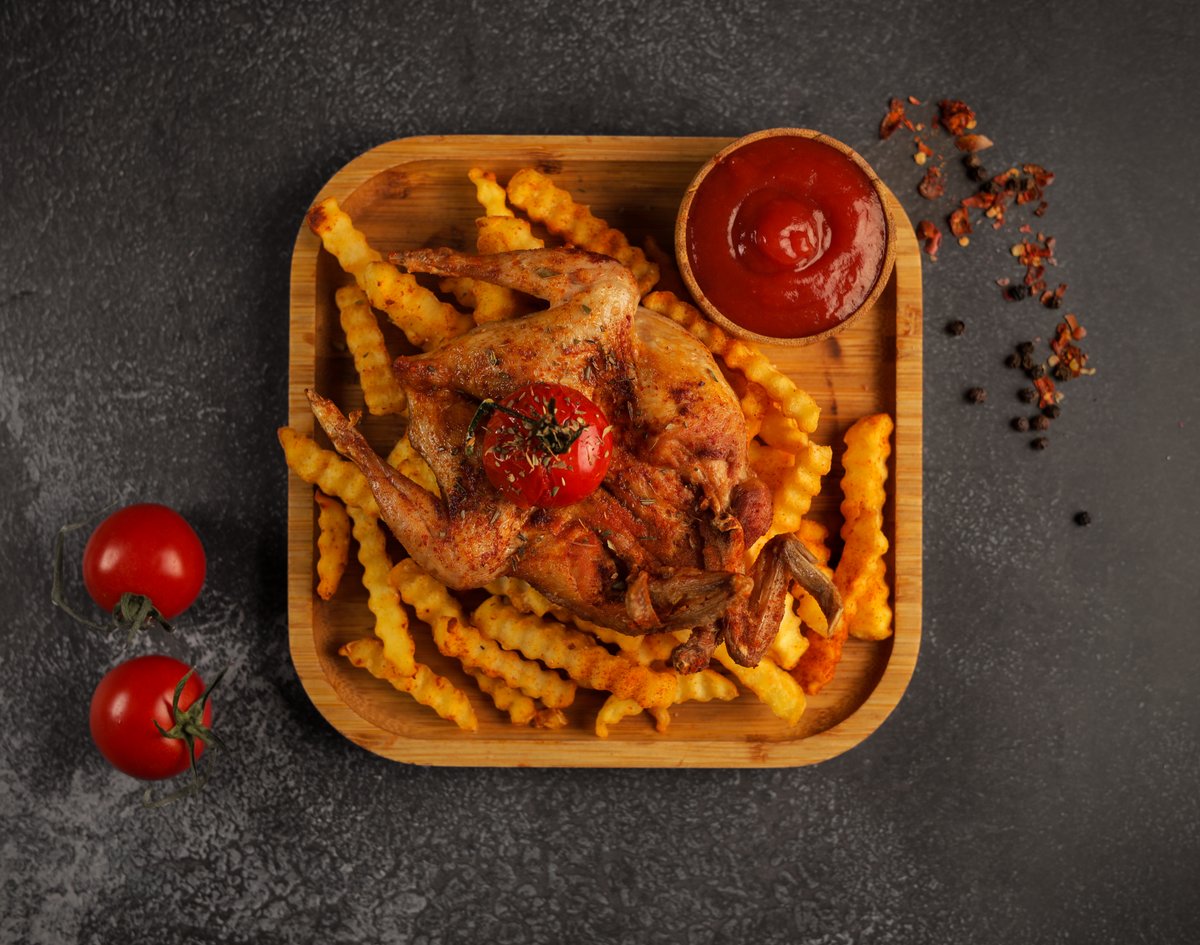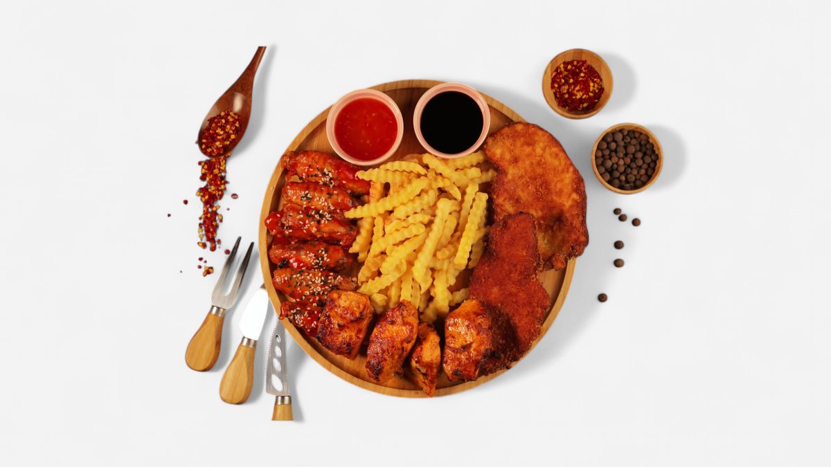 ქათმის ფრთები; ქათმის მწვადი; ქათმის ნაგეთსი; კარტოფილი ფრი; კეჩუპი; მაშარაფის სოუსი