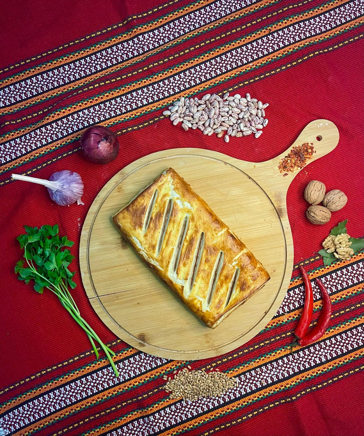 ფქვილი,ზეთი,საფუარი,მარილი,ლობიო,ხახვი,შებოლილი სულგუნით