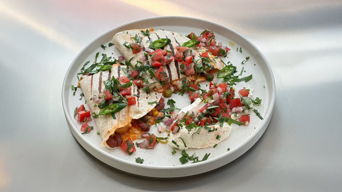 chicken, beans, corn, pea, garlic, onion, sweet chili sauce, sunflower oil, sulguni mozzarella cheese, tortilla up: sour cream, tomato salsa (tomato, red onion, parsley, lemon juice)