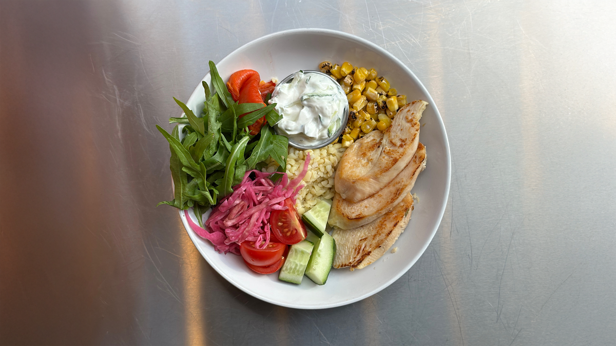 chicken fillet, bulgur, tzatziki, roasted pepper, pickled red cabbage, arugula, cucumbers, corn, cherry tomatoes
