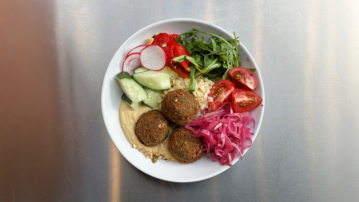 falafel, bulgur, hummus, roasted pepper, pickled red cabbage, arugula, cucumbers, radish, cherry tomatoes, dukkah