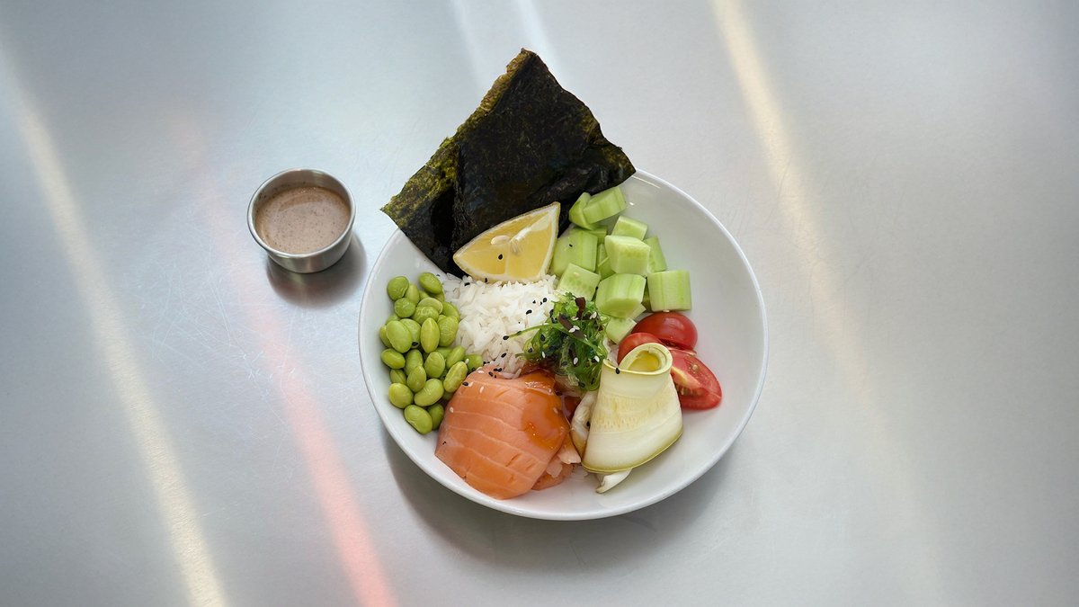 smoked salmon, basmati rice, edamame, wakame, nori, marinated zucchini, cucumbers, cherry tomatoes, sesame sauce, teriyaki sauce, lemon, sesame