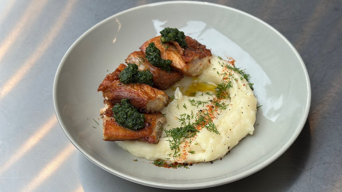 chicken thighs (whithout bones), creamy puree, green ajika (cilantro, parsley, garlic, olive oil, lemon, dill), shichimi togarashi