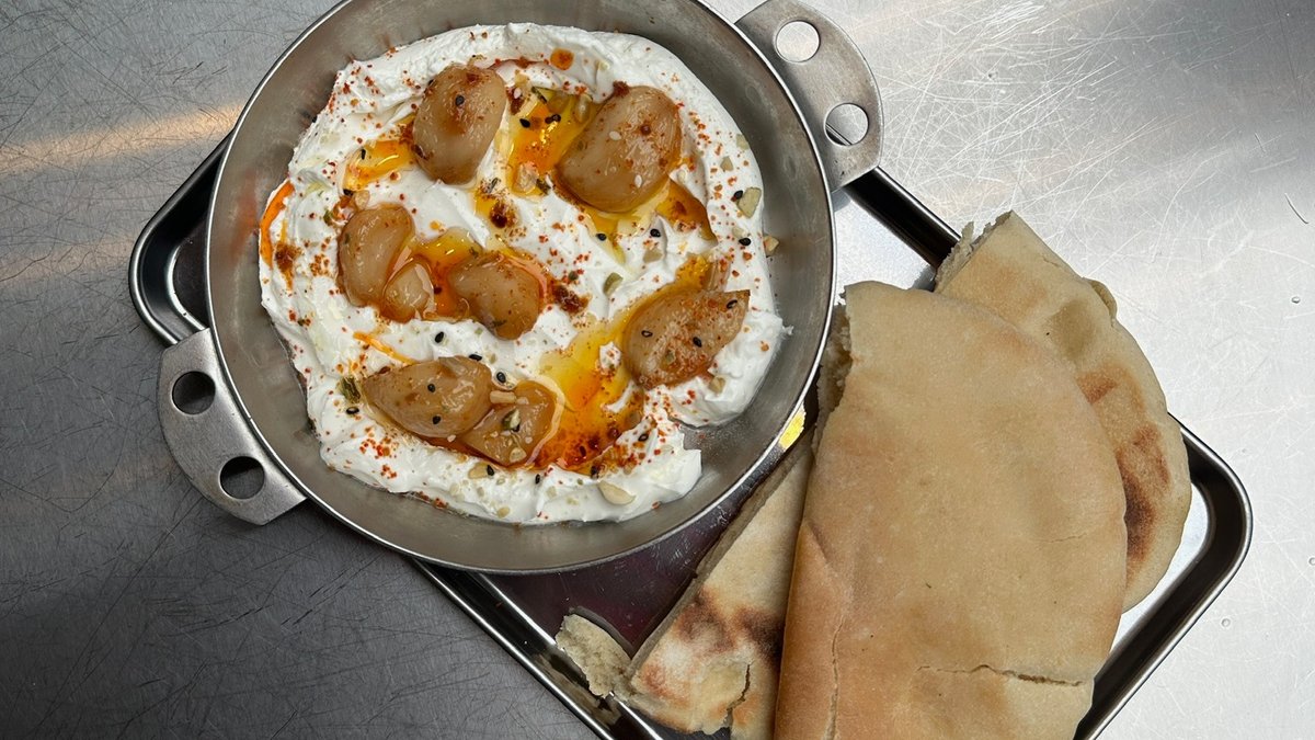Labneh Dip w Garlic Confit, Harissa Sauce, and Pistachio (kkal 602)