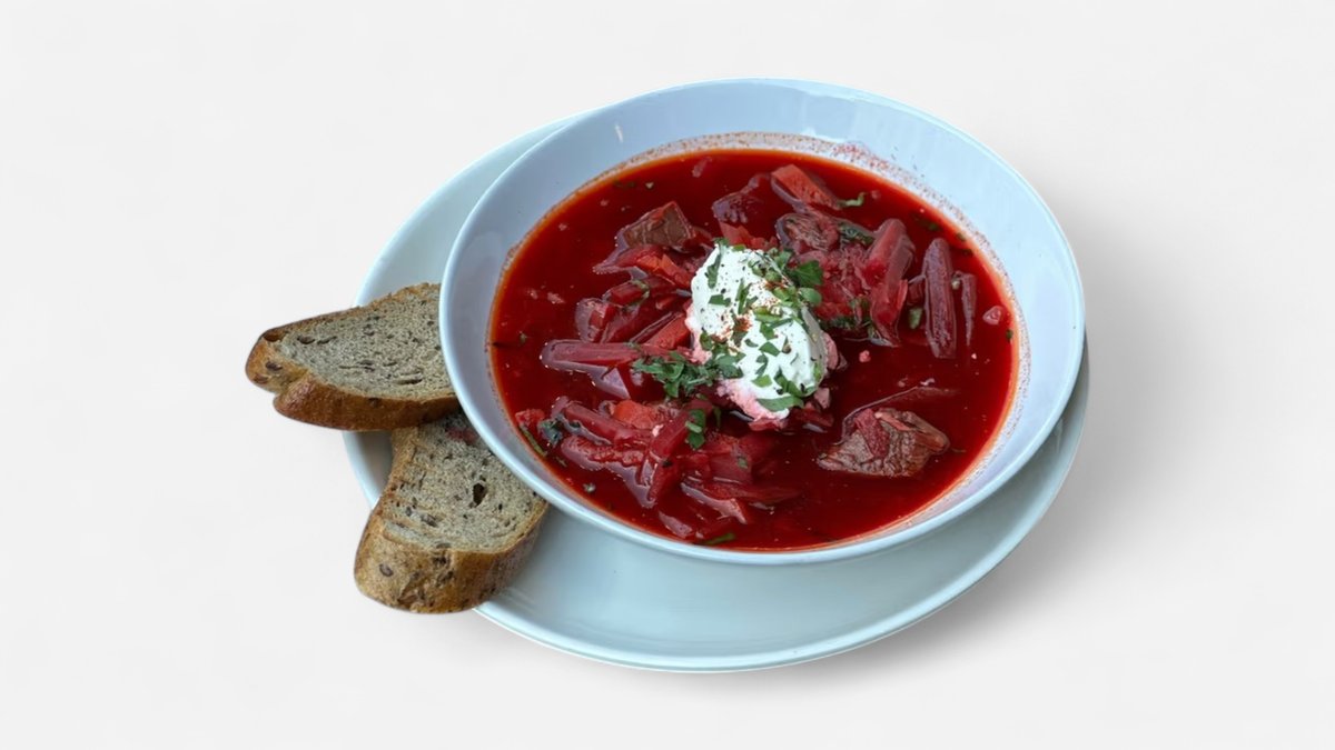 cabbage, beetroot, beef bones, beef, potato, bell pepper, red onion, carrot, white balsamic, garlic, black pepper, parsley, sour cream, bread