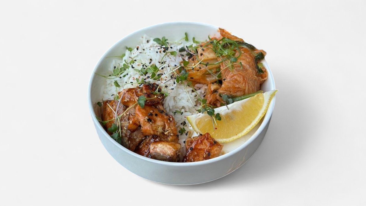 salmon, teriyaki sauce, rice, kimchi (napa cabbage, carrot, white onion, garlic, ginger, paprika, ground pepper, rice, green onion), wakame, lemon, sesame