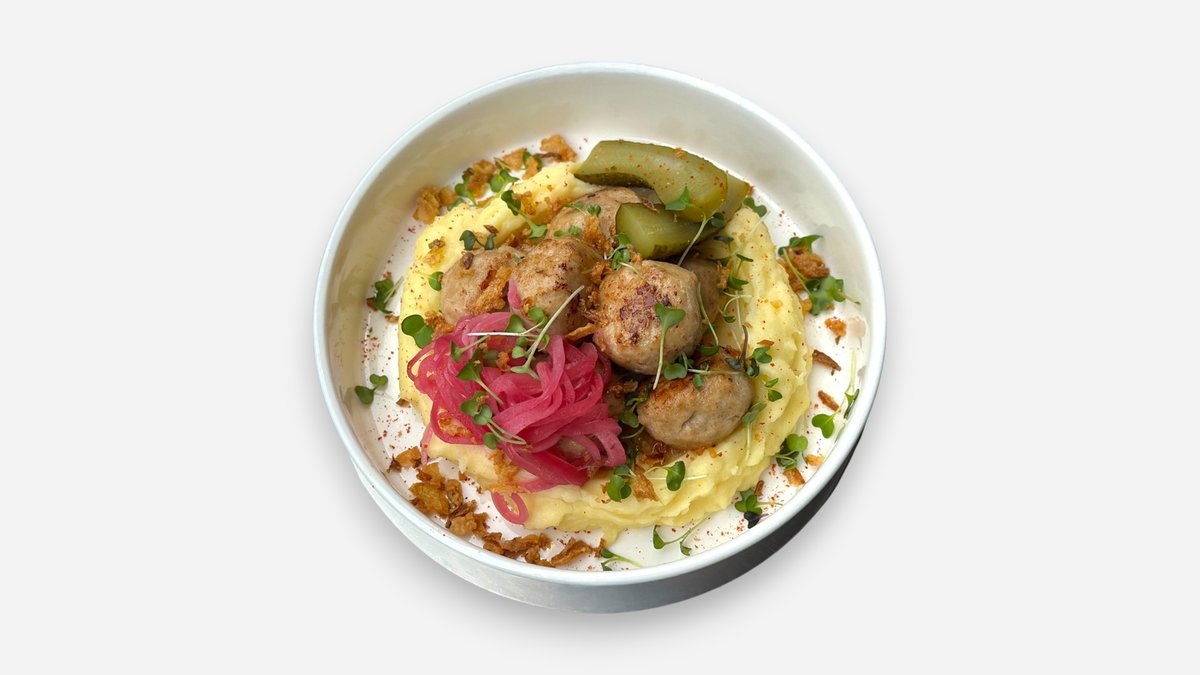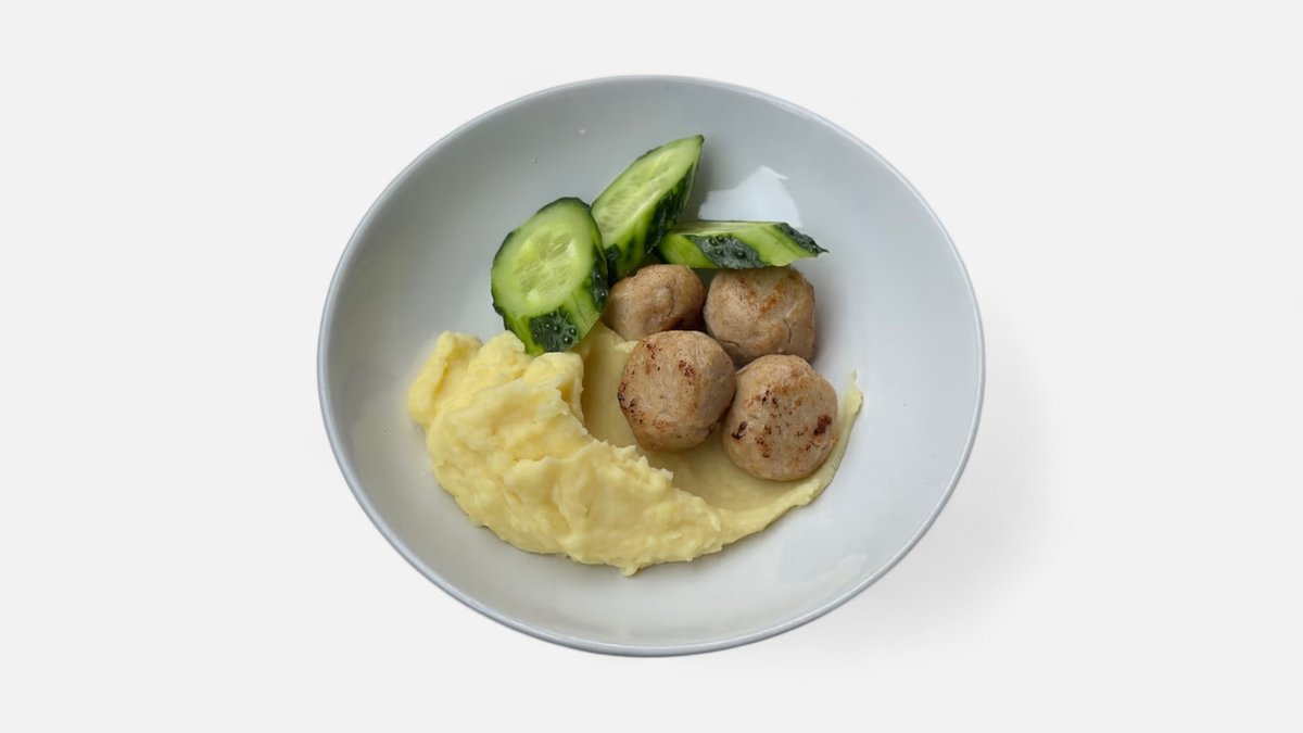 Chicken Meatballs w Mashed Potatoes and Pickles